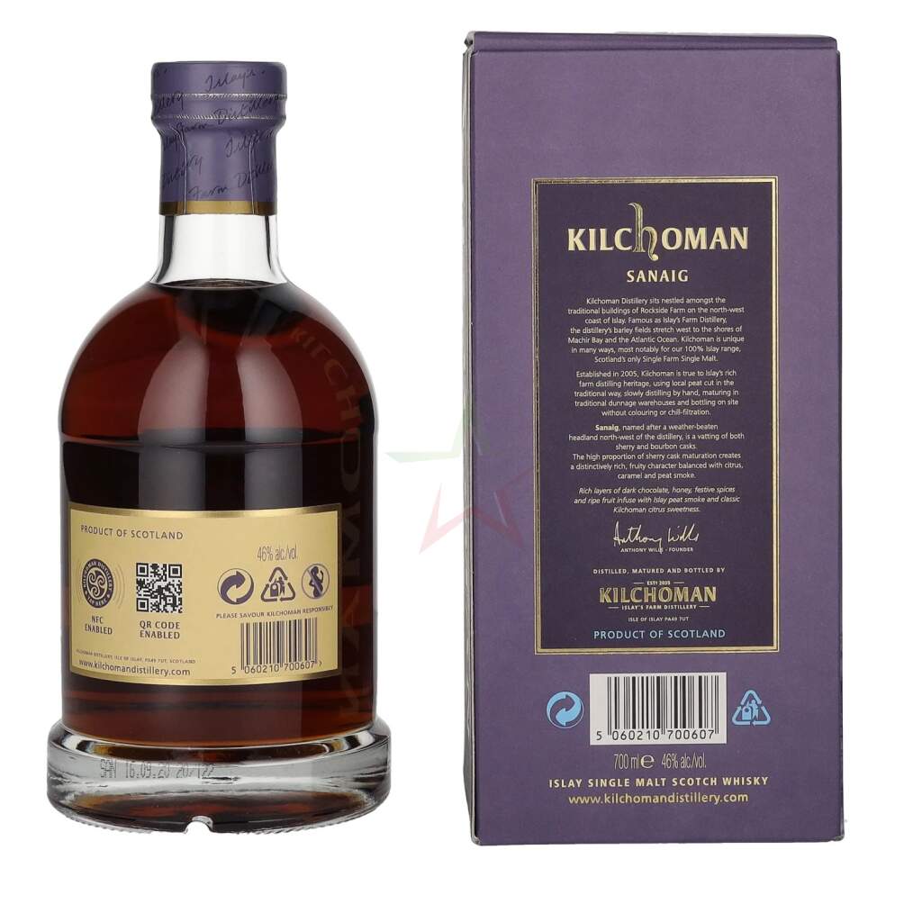 Erleben Sie den Kilchoman SANAIG Islay Single Malt Scotch Whisky, ein wahres Juwel aus der renommierten Kilchoman-Destillerie auf der schottischen Insel Islay. Mit einem Alkoholgehalt von 46 % bietet dieser Whisky eine meisterhafte Kombination aus Rauch und Torf, die typisch für Islay ist, gepaart mit einer beeindruckenden Komplexität und Tiefe.