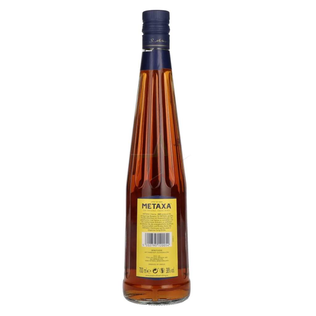 Scopri con Metaxa 5 Stelle 38% Vol. 0,7l l'essenza della cultura del piacere greca. Questo squisito distillato, noto per la sua qualità eccezionale dal 1888, unisce distillati di vino invecchiati, dolce vino moscato delle isole Egee e le migliori erbe mediterranee. Il processo di invecchiamento accurato in botti di rovere Limousin per almeno cinque anni conferisce a Metaxa la sua texture incredibilmente morbida e il caratteristico colore giallo miele.
