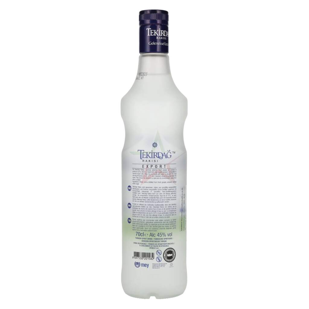 Entdecken Sie den Tekirdag Rakisi 45% Vol. 0,7l – ein Meisterwerk türkischer Destillationskunst. Dieser edle Raki verkörpert die Essenz der türkischen Kultur und Tradition. Hergestellt in der renommierten Region Tekirdag, wird er aus erlesenem Traubenalkohol und aromatischem Anis nach traditionellen Methoden doppelt destilliert. Das Ergebnis ist ein außergewöhnlich weiches und harmonisches Geschmacksprofil, das Kenner weltweit begeistert.